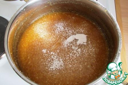 Снимаем кастрюлю с огня, вливаем ликер, перемешиваем, посыпаем поверхность сахарной пудрой, чтобы не образовалась плотная корочка, охлаждаем.