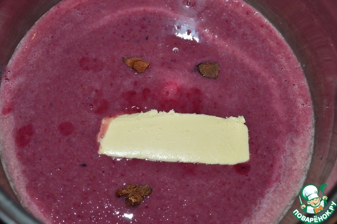 В смородиновое пюре добавить сахар и яйца, хорошо перемешать. Переложитьв кастрюлю с толстым дном, добавить сливочное масло и бадьян. Готовить на водяной бане до загустения.