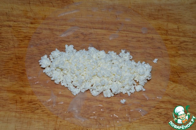 Творог хорошо смешать с сахарной пудрой, для однородности можно добавить пару ложек сметаны. Выложить 1,5-2 ст. л. на рисовую бумагу.