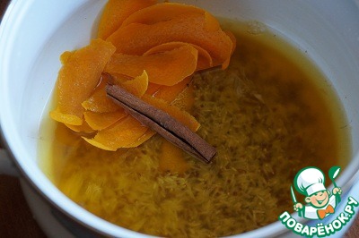 Итак, шафран настоялся, процедили его, вливаем его в кастрюлю, добавляет туда же сок, смесь риса, кладем цедру апельсина и палочку корицы.