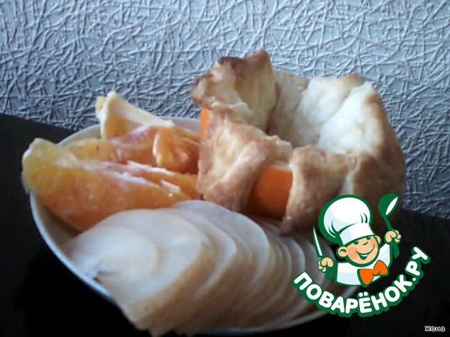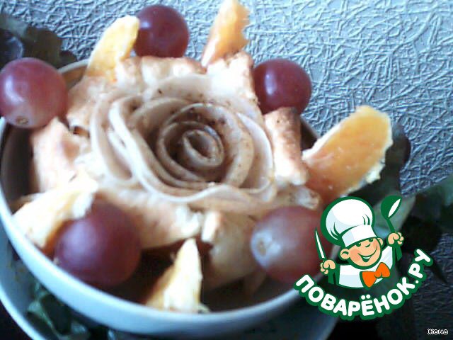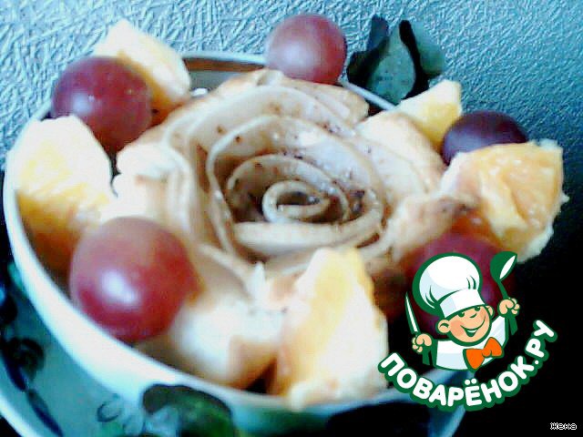 И собираем розочку из нарезанных пластинок груши. Чуть украсить дольками апельсина и виноградинами. Приятного аппетита.