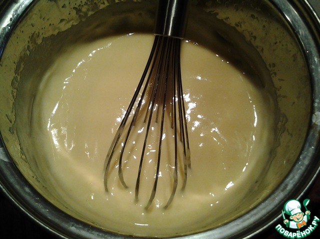 Поставить на водяную баню и потихоньку вливать шампанское (вино). Взбивать 10 минут. Масса должна увеличиться в объеме и загустеть.