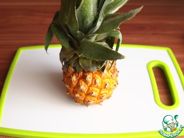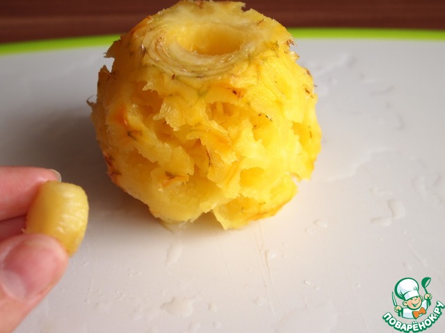 Отрезать от сердцевины маленький кусочек и закрыть им основание ананаса (для того, чтобы не выливался конфитюр, который мы положим в сердцевину).