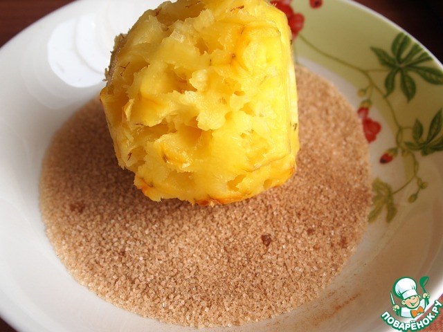 Смешать сахар с корицей и хорошенько обвалять ананас.
