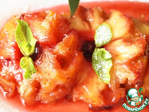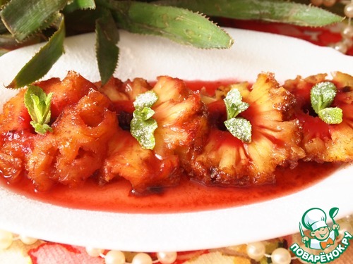 Остывший ананас порезать на кусочки и полить соком из формочки, который ананас выделил при запекании.