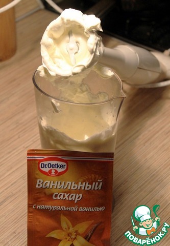 Взбиваем сливки с сахарной пудрой, у меня под рукой оказался сахар с ванилькой, тоже не дурно.