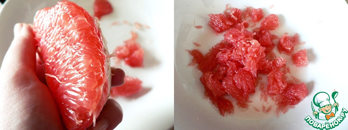 Грейпфрут очистить от кожуры и белых плёнок, порезать на средние кусочки.