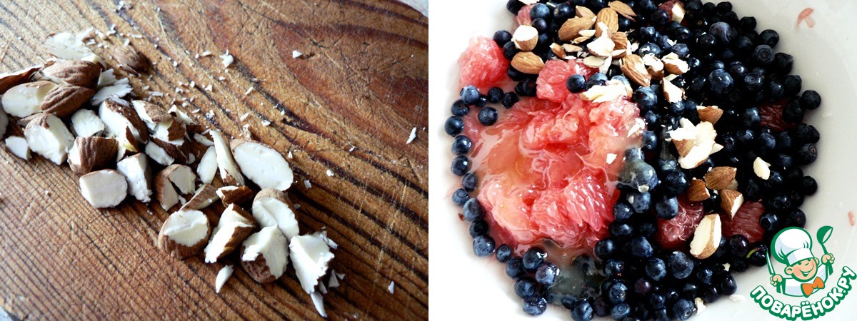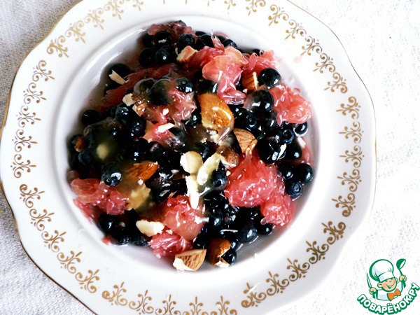К грейпфруту добавить черники, мёд и миндаль-перемешать.