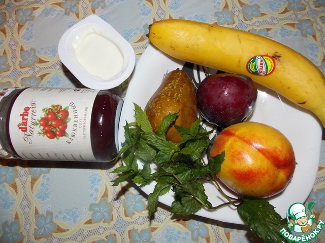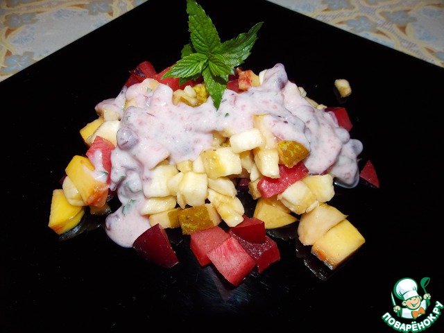 | Сладкие фрукты в сочетании с заправкой из классического йогурта, клюквенного соуса и мяты. Очень вкусно и не калорийно, думаю, можно есть такой салатик даже перед сном. |