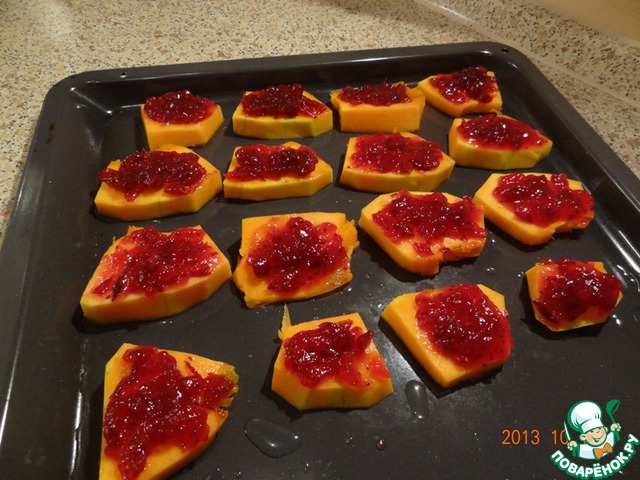 Тыкву нарезать ломтиками толщиной в 1 сантиметр, выложить на противень, смоченный водой. Смазать ломтики тыквы клюквенным соусом "D arbo". Выпекать при температуре 150-180 градусов, пока тыква не станет мягкой.