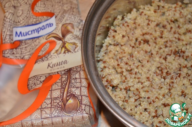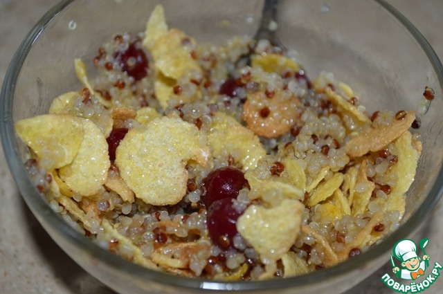 Растопить немного сливочного масла добавить в него мед, киноа, клюкву и кукурузные хлопья. Заранее начинку не готовить так как хлопья разбухнут и будут невкусными.