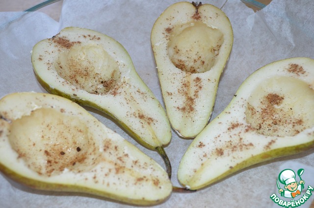 Груши вымыть, разрезать пополам, удалить сердцевину сделав углубление. Смазать сливочным маслом посыпать специями и запекать 10-15 минут в разогретой до 200 С духовке.