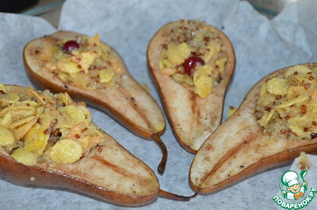 Сразуже выложить начинку на груши и запекать еще 5 минут. Дать слегка остыть, чтобы хлопья снова стали хрустящими. Подавать с мороженным.