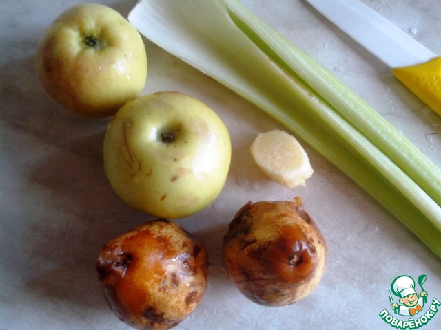 Выход сока из сельдерея, к нему добавить такое же количество яблочного сока, из этого набора продуктов получается 260 г сельдерейного и яблочного пополам
