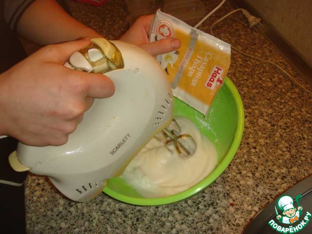Добавляем в белок ванильный сахар и продолжаем взбивать, пока белок не станет плотной воздушной пеной. Пробуйте пену на вкус, если хотите сделать сладкий безе белок должен быть сладким!.
