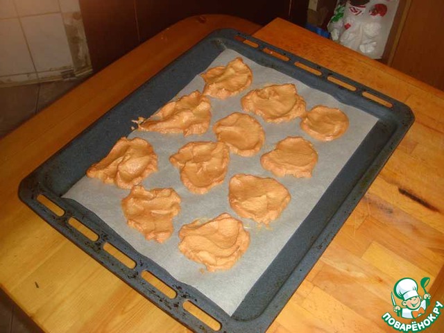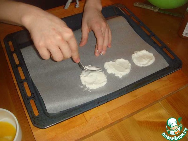 Выкладываем белок на противень столовой ложкой и выравниваем его в печеньки толщиной примерно 5 мм.