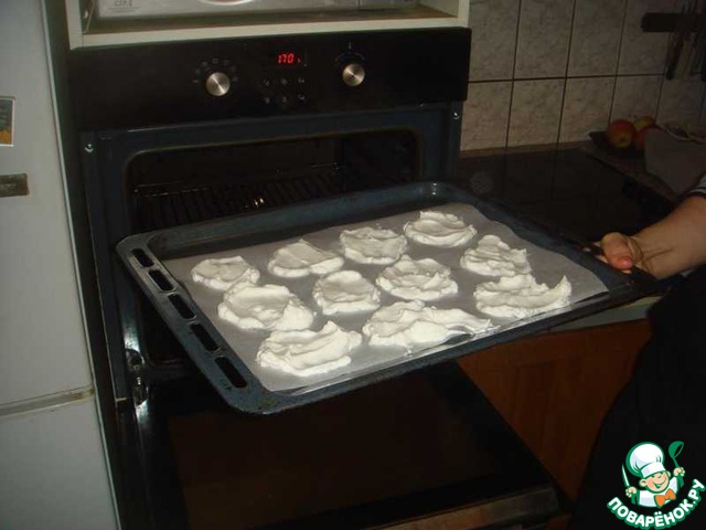 Ставим получившееся полубезе в духовку на 160-170гр на режим вентилятора, на 25 минут ( примерно), пока безе не станут плотными, возможно через минут 20 безе уже начнут желтеть, но не станут плотными, тогда имеет смысл приоткрыть духовку, чтобы они просохли, такое может случится из-за плохой вентиляции в вашей духовке.