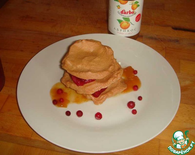 | Ягодный Манфин, это блюдо родилось у меня в голове неожиданно, и результат получился необыкновенным. Я старался сделать рецепт низкокалорийным, поэтому в безе добавлял не много ванильного сахара, а для начинки использовал Абрикосовый конфитюр D’arbo и замороженные ягоды, вы же можете не скупиться в добавлении сахара, чтобы сделать безе очень сладким, тогда в сочетании с кислыми ягодами, Вы получите именно тот вкус о, котором потом говорят, что это был потрясающий десерт, ну или просто добавить больше конфитюра D’arbo. |