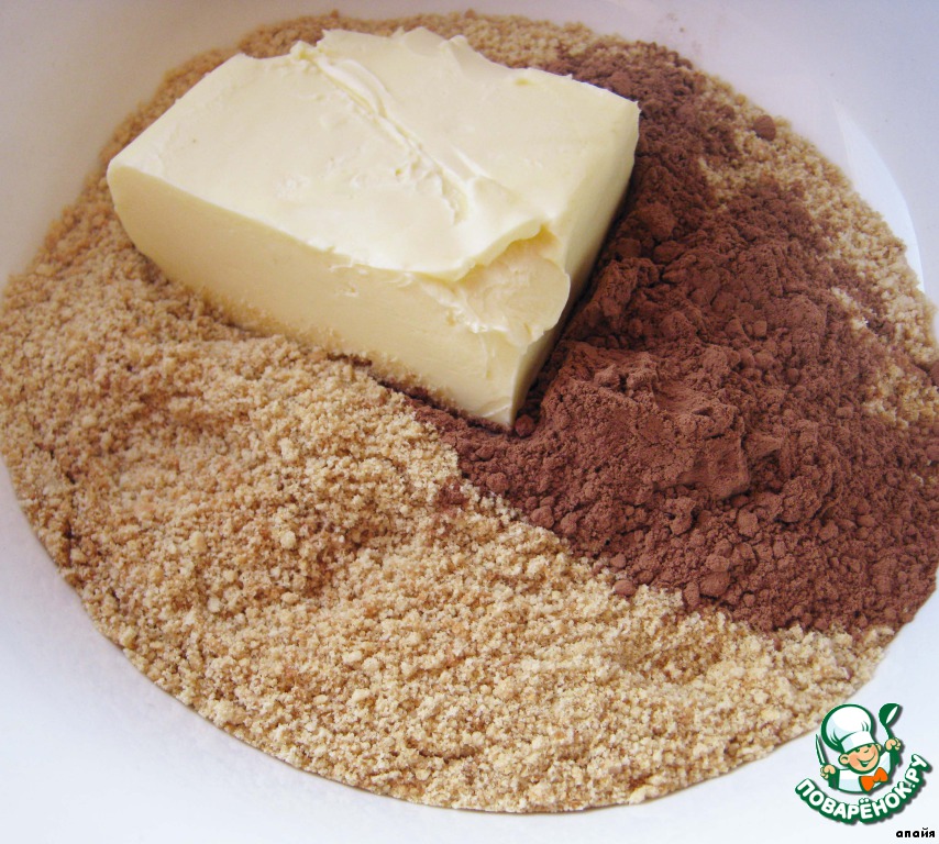 Измельчила печенье в блендере в крошку, добавила какао, сливочное масло и все тщательно перемешала. Готовую массу утрамбовала на дно формы.