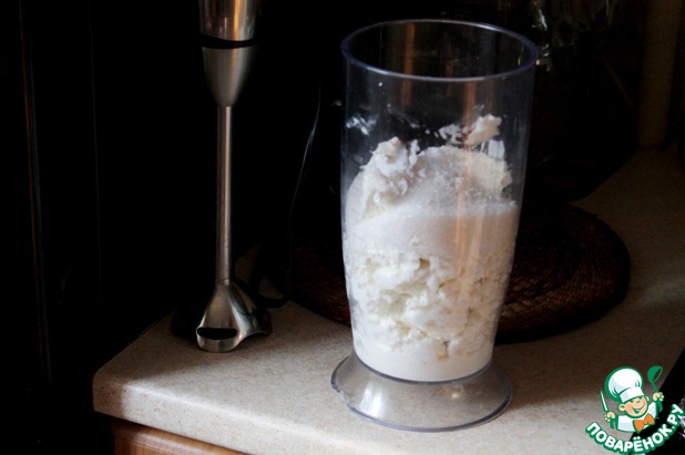Творог с сахаром и сметаной взбить блендером до однородности, количество сахара регулировать по своему вкусу.