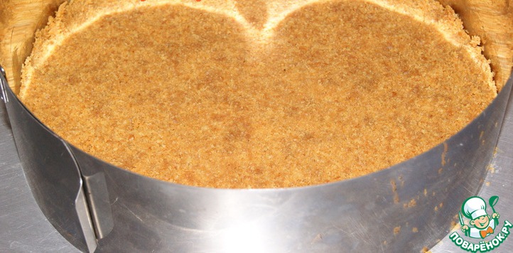 Смешать масло с крошкой из печенья и выстелить хорошо прессуя на дно формы 22-24 см в диаметре, поставить в холодильник и дать застыть.