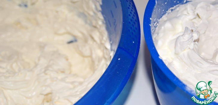 Сливочный крем (творог) взбить с мёдом. В отдельной ёмкости взбить сливки с сах. пудрой до устойчивых пиков.