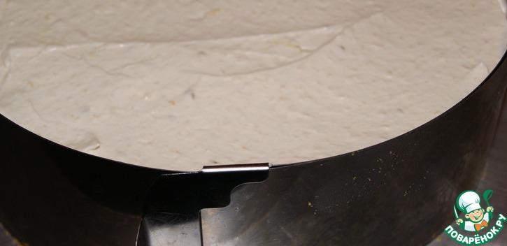 Поместить крем сверху коржа и поставить форму на ночь в холодильник.