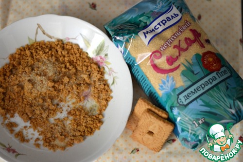 Теперь слой печенья: измельчить его до крошки, добавить 1 ч. л. коричневого сахара и щепотку корицы. Размешать.