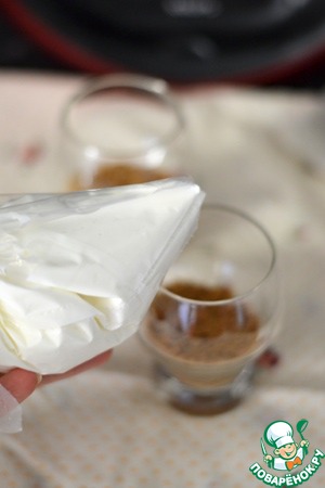 Распределить слой печенья по верринам. Затем аккуратно разложить крем. Я использовала кондитерский мешочек.