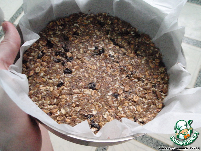 Форму (у меня D=21см) простелить кулинарным пергаментом, равномерно утрамбовать ложкой, печь при t=200С 10мин (пекла в аэрогриле при t=205оС 10мин, скорость средняя).