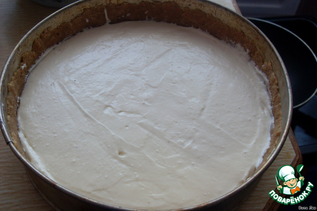 На застеленную пекарской бумагой круглую форму выкладываем эту массу и распределяем, сделав бортик. Отправляем в холодильник на 15 минут. Разогреваем духовку до 175 градусов.