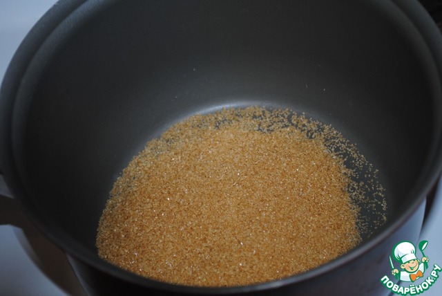 Лучше начать готовить соус или ореховое пралине. Я начала с соуса. В кастрюльку высыпаем сахар и топим его до состояния жидкой карамели, периодически помешивая. Чтобы помочь карамели растопиться, добавьте немного воды