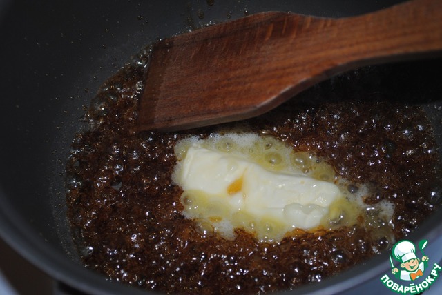 Когда карамель побулькала минуту-две, и пошел отчетливый карамельный запах, даем туда шматок сливочного масла, ванилин и корицу. Ждем, пока масло растопится, легко покручивая кастрюльку, но не перемешивая!