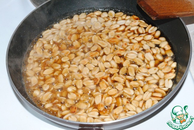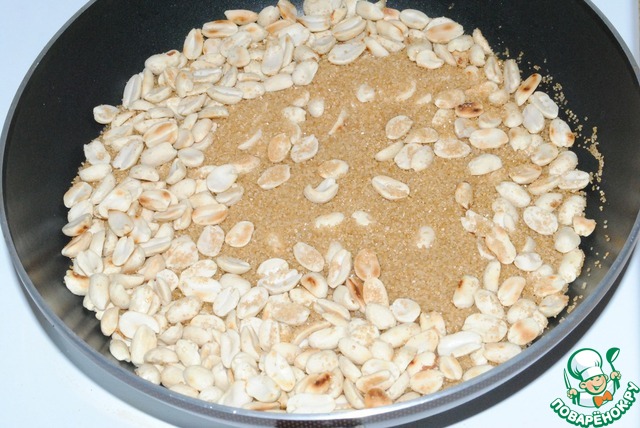 Когда орехи подрумянятся, даем туда сахар и перемешиваем