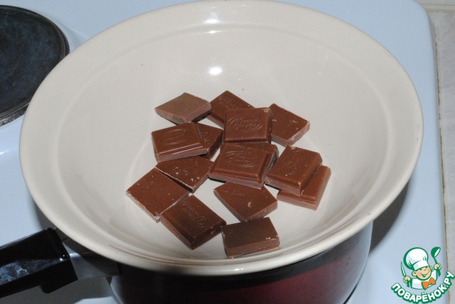 Когда тортик еще немного постоит при комнатной температуре и останется немного теплым, начинаем топить шоколад на водяной бане
