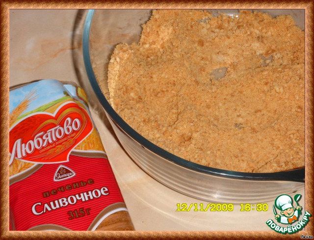 [b]Основа.[/b]100 г измельченного печенья, 60 г растопленного сливочного масла, хорошо вымешать.