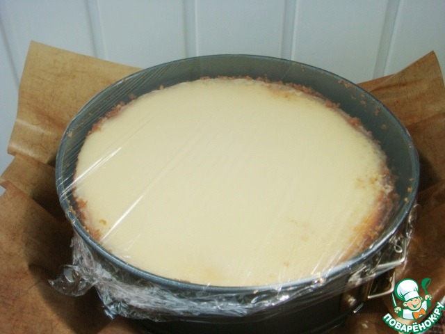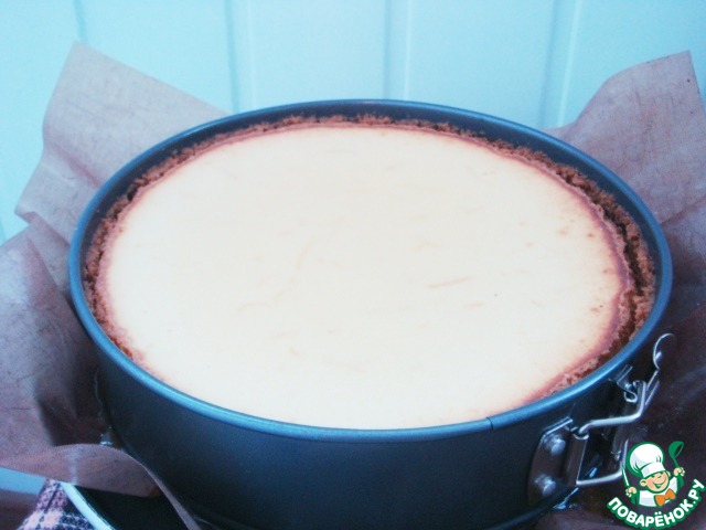 Форму поставить на лоток, большего размера и выпекать в разогретой до 180 градусов духовке 15 минут. Затем опустить температуру духовки до 120 градусов и выпекать еще примерно 60 минут или до тех пор пока только центр чизкейка останется немного влажным и шатким. Вынуть из духовки и поместить на решетку.