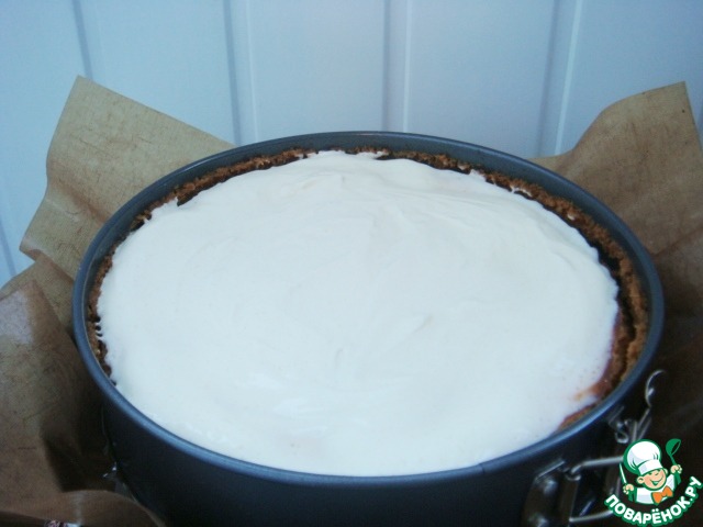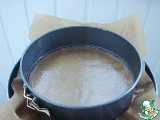 Достать форму из холодильника и вылить сливочную смесь на корж. Разровнять ложкой.