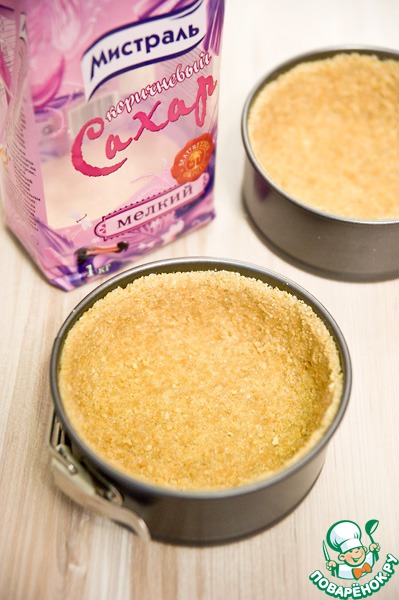 Для коржа я использовала мелкий коричневый сахар "Мистраль". В блендере измельчить печенье, добавить сахар и сливочное масло. Смешать до состояния песочного теста.