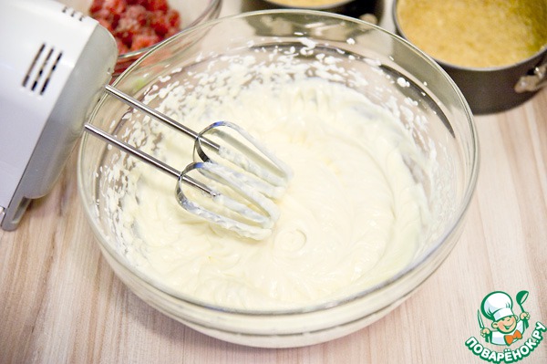 При помощи миксера на низкой скорости взбить сыр со сгущенным молоком. Добавить яйца и ванилин и еще раз взбить до однородности. Разделить массу на две равные части.