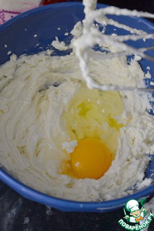 Вбить одно яйцо, хорошо размешивая миксером, а потом второе, снова размешать до однородности.