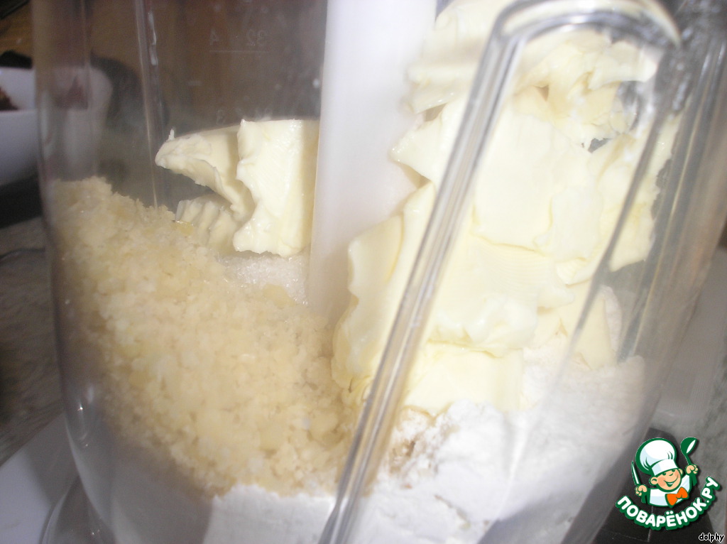 Чтобы сделать корж, поместите в чашу кухонного комбайна муку, миндальную крошку, сахарную пудру (у меня просто сахар) и масло.
