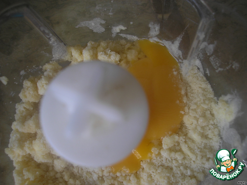 Добавьте желток и еще чуть-чуть смешайте в комбайне, чтобы тесто начало слипаться.