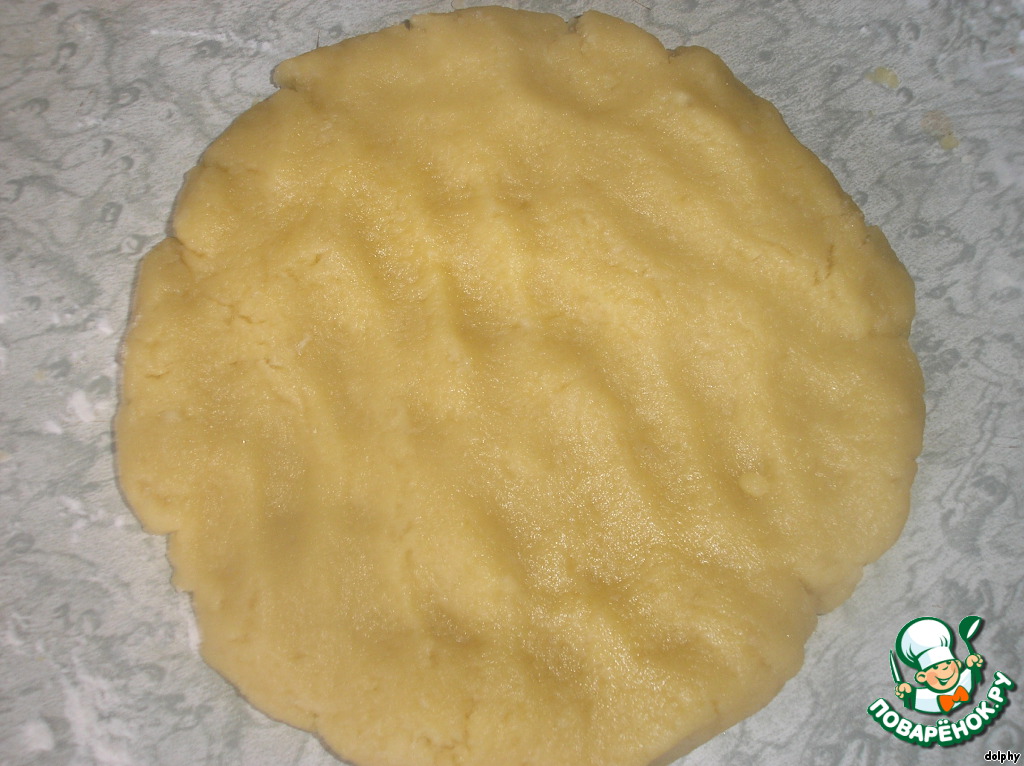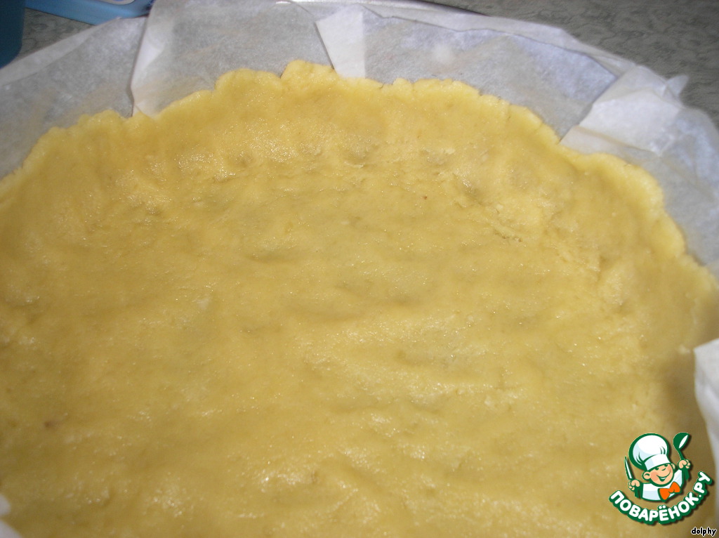 Тесто раскатайте, сделайте из него круг по размеру формы (рекомендуется круглая форма диаметром 20 см), выложите в форму. Я не раскатывала тесто, а сформировала основу руками прямо в форме. Поставьте в холодильник еще на 15 минут.