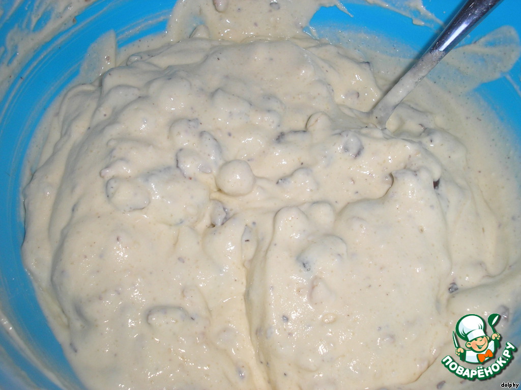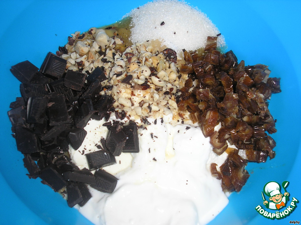 Тем временем смешайте орехи, рикотту (у меня Almette), сахар, сметану, яйца, шоколад, цукаты (у меня финики) и коньяк.