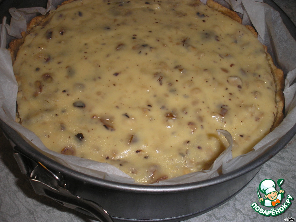 Готовый корж достаньте из духовки, уменьшите жар до 180 гр. Выложите начинку на основу и разровняйте ее ложкой. Прошу прощения, забыла сфотографировать этот этап.