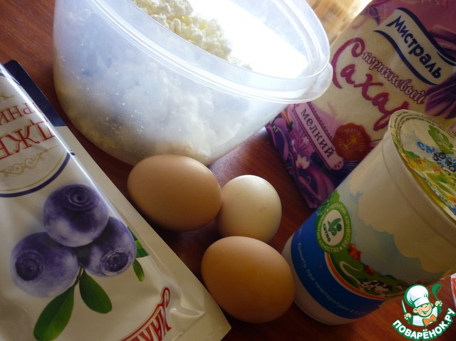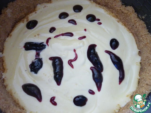 Соединить при помощи миксера творог, сметану, сахар и яйца. Выложить 1/3 на корж. На творожную массу нанести черничный джем.