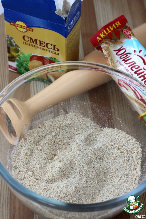 Для основы чаще всего берут печенье. Я поступила так же, но, чтобы немного уменьшить сладость и калорийность основы, к одной пачке печенья "Юбилейного", смолотого в крошку, добавила 100 гр панировочных сухарей.