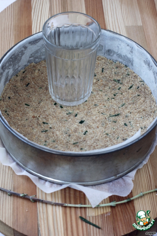 Порезать листики от двух веточек ромарина (для любителей), нелюбители могут ограничиться 1-2 ст.ложками. Растопить масло в микроволновке, добавить к крошке. Много масла в основе я тоже не люблю, во время выпечки оно, бывает, просто вытекает через щели формы, поэтому в этот раз взяла абсолютный минимум на такое количество крошки - 100 грамм. Получилось суховато, но вполне прилично повело себя в форме, утрамбовалось и слепилось в плотный корж. Для подстраховки я немного сбрызнула утрамбованную основу водой. Вы можете поступить так же, как я, а можете добавить немного масла, ведь разные сорта печенья обладают разной жирностью и влажностью, поэтому смотрите по ситуации.