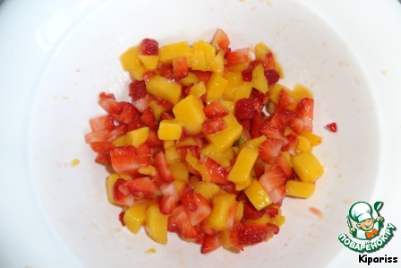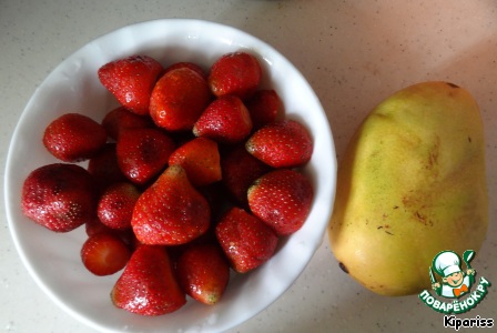 Часть клубники и половинку манго порезать мелкими кусочками, примерно вот столько.